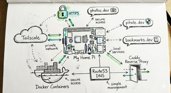 So I built a setup using Tailscale for private networking, Caddy as a reverse proxy, Let’s Encrypt for certificates generation and renewal via Route53 DNS challenges, and a bunch of Docker containers running on a humble Raspberry Pi. It’s been running reliably for two years now.